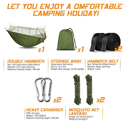 - 【Ampia area ed elevata capacità di carico】Realizzata con materiali in nylon paracadute con cuciture a triplo ago, e tessuto speciale a rete anti-insetti, ripstop durevole e forte.Dimensioni, 260x 140 cm(102,36 x 55,11 pollici),Grazie ai materiali durevoli. Abbastanza resistente, può contenere fino a 200 kg. L'esclusivo design del cinturino ha una resistenza alla rottura doppia rispetto alla maggior parte dei concorrenti