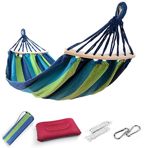EASY EAGLE Amaca da Giardino con 60CM Aste di Legno, 220x120CM Amache Cotone con Cuscino Gonfiabile per Campeggio Viaggio, Carico 300KG, Strisce Verde-blu