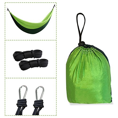 Super facile da usare - L'intera imballaggio include amaca, corde, moschettoni e pacchetti di imballaggio. A prescindere da chi (campeggiatori professionisti o casalinghe), è molto facile impostare l'amaca da campeggio in quanto è incluso tutto il necessario.
