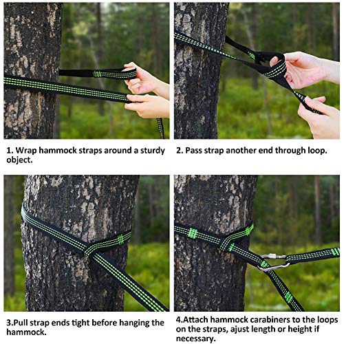 - Ambito di applicazione: le cinghie per amache sono adatte per il fissaggio di amache di tutte le dimensioni. Hai solo bisogno di fissare le cinghie dell'amaca e l'amaca con moschettone in alluminio.